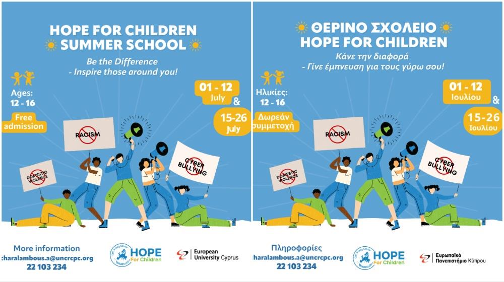 Το “Hope For Children” CRC Policy Center, ανακοινώνει τη λειτουργία Θερινού Σχολείου για 2η συνεχή χρονιά! Μέσω του Θερινού Σχολείου έφηβοι από διάφορες κοινωνικές ομάδες ( ηλικίας 12-16 ετών) θα ενισχύσουν τις ηγετικές, επικοινωνιακές και οργανωτικές τους δεξιότητες, την κριτική σκέψη καθώς επίσης θα εμπλουτίσουν τις γνώσεις τους σε θέματα που αφορούν τη προστασία των παιδιών.