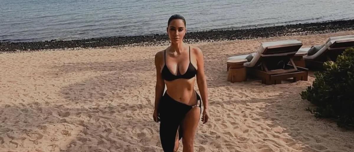 Στα νέα στιγμιότυπα που ανέβασε, η Κιμ Καρντάσιαν ποζάρει στην άμμο, με ένα μαύρο μαγιό και ίδιου χρώματος παρεό.