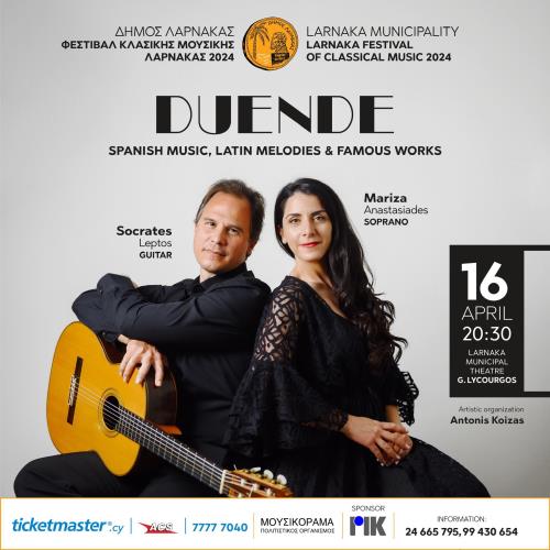 Η σοπράνο Μαρίζα Αναστασιάδη και ο κιθαρίστας Σωκράτης Λεπτός έχουν ετοιμάσει ένα μοναδικό πρόγραμμα με "Ισπανική Μουσική, Λατινoαμερικάνικες Μελωδίες και Δημοφιλή Έργα" και υπόσχονται να απογειώσουν το κοινό σε ένα μαγευτικό ταξίδι με μουσικές απ΄ όλο τον κόσμο.