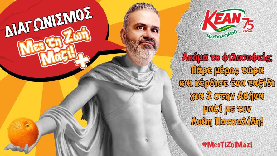 Και αφού το #MesTiZoiMazi δεν είναι ένα απλό σλόγκαν, αλλά μία ολόκληρη φιλοσοφία για να απολαμβάνουμε περισσότερο τη ζωή, ο Λούης Πατσαλίδης ντύθηκε… αρχαίος Αθηναίος φιλόσοφος για το video και το post του διαγωνισμού που τρέχουν στα social media της ΚΕΑΝ και καλούν τους χρήστες να κάνουν follow την KEAN, Like στα posts και tag σε σχόλιο το άτομο με το οποίο θέλουν να μοιραστούν το ταξίδι στην Αθήνα.