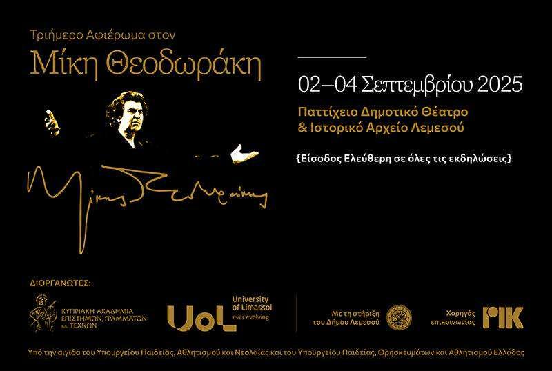 Με την ευκαιρία της συμπλήρωσης εκατό ετών από τη γέννηση του εμβληματικού Έλληνα συνθέτη Μίκη Θεοδωράκη (1925–2025), η Κυπριακή Ακαδημία Επιστημών, Γραμμάτων και Τεχνών και το Πανεπιστήμιο Λεμεσού, με τη στήριξη του Δήμου Λεμεσού και χορηγό επικοινωνίας το ΡΙΚ, διοργανώνουν τριήμερο αφιέρωμα εις μνήμην του από τις 2 έως τις 4 Σεπτεμβρίου 2025.