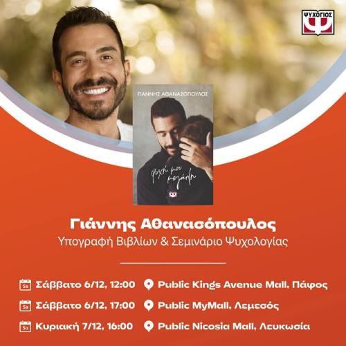 Τα Public καλωσορίζουν τον καταξιωμένο συγγραφέα και κλινικό ψυχολόγο Γιάννη Αθανασόπουλο σε μια τριπλή σειρά εκδηλώσεων σε Πάφο, Λεμεσό και Λευκωσία.