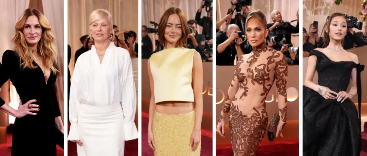 Miley Cyrus με Saint Laurent, Ariana Grande με custom Vivienne Westwood Couture, Selena Gomez με Chanel, Zoë Kravitz με custom Saint Laurent, Amal Clooney με vintage Balmain by Pierre Balmain, Emma Stone με Louis Vuitton, Amanda Seyfried με Versace, Jessie Buckley με Dior, Ayo Edebiri με Chanel, Pamela Anderson με Ferragamo, Jennifer Lawrence με Givenchy by Sarah Burton, Jennifer Lopez με Jean-Louis Scherrer, Charli XCX με Saint Laurent, Chase Infiniti με Louis Vuitton, Mia Goth με Dior, Rhea Seehorn με Louis Vuitton, Teyana Taylor με Schiaparelli, Julia Roberts με Armani Privé