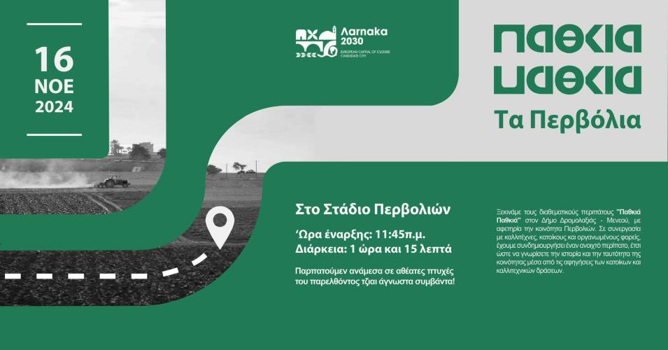 Στο πλαίσιο των δράσεων του Οργανισμού Λάρνακα 2030, που τρέχει την υποψηφιότητα της πόλης ως Πολιτιστική Πρωτεύουσα της Ευρώπης για το έτος 2030, οργανώνονται πέντε διαθεματικοί περίπατοι με τον τίτλο "Παθκιά Παθκιά" στις κοινότητες του νεοσύστατου Δήμου Δρομολαξίας – Μενεού.