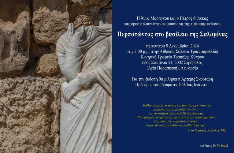 Η τριλογία ««Περπατώντας στο βασίλειο της Σαλαμίνας» εκδόσεις Το Ροδακιό, Αθήνα, 2024 είναι το νέο βιβλίο της Άννας Μαραγκού με φωτογραφίες του Πέτρου Φιάκκα, που θα παρουσιαστεί στο κοινό της Λευκωσίας το βράδυ της 9ης Δεκεμβρίου στα Κεντρικά Γραφεία της Τράπεζας Κύπρου (Αγία Παρασκευή), στη Λευκωσία.