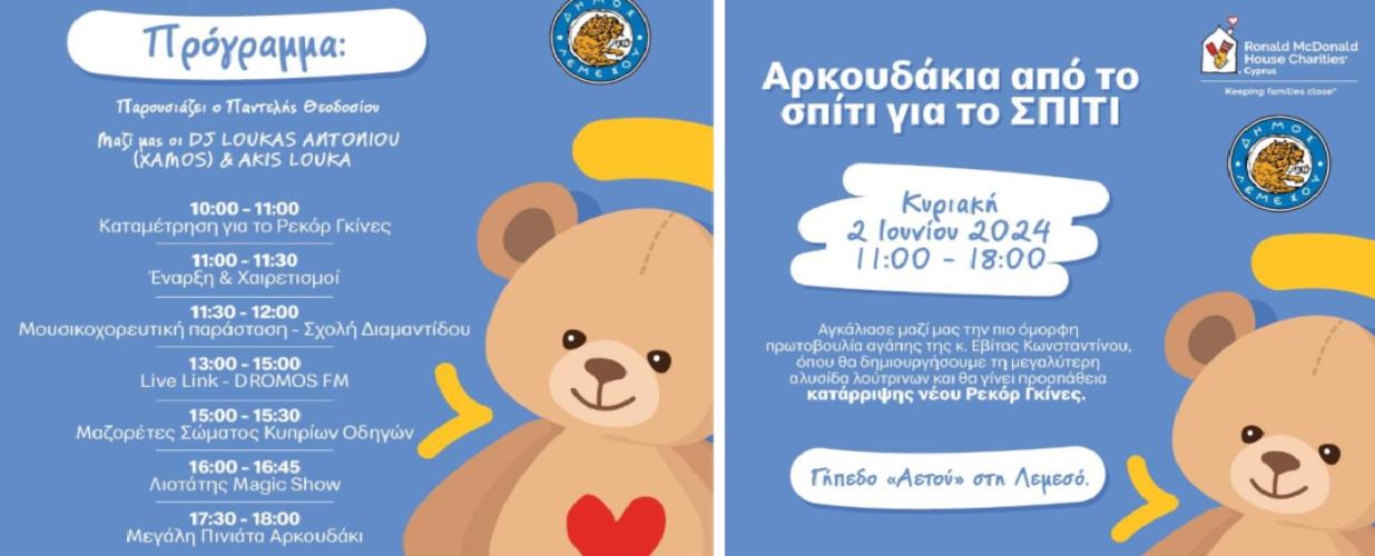 Την Κυριακή, 2 Ιουνίου 2024, από τις 11:00 το πρωί μέχρι και τις 6:00 το απόγευμα, στο Γήπεδο «Αετού» στη Λεμεσό, θα πραγματοποιηθεί η δεύτερη φάση της πρωτοβουλίας, στο πλαίσιο της οποίας θα δημιουργηθεί η μεγαλύτερη αλυσίδα λούτρινων στον κόσμο, θα γίνει τελική καταμέτρηση και προσπάθεια κατάρριψης νέου Ρεκόρ Γκίνες, καθώς και…πώληση λούτρινων σε προνομιακές τιμές.