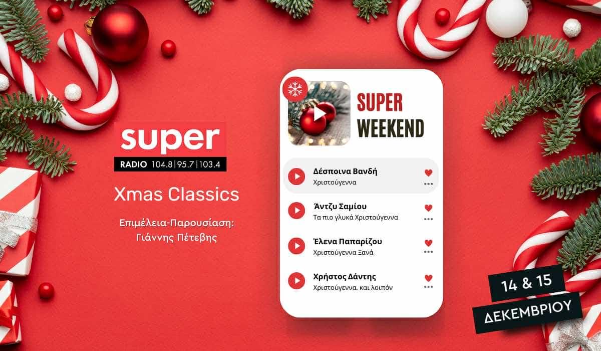 Από ελληνικές μελωδίες που ζεσταίνουν την καρδιά μέχρι διεθνείς επιτυχίες που γέμισαν αναμνήσεις τα χριστουγεννιάτικα βράδια μας, αυτό το SUPER Weekend είναι αφιερωμένο στα τραγούδια που συντροφεύουν κάθε μας γιορτή.