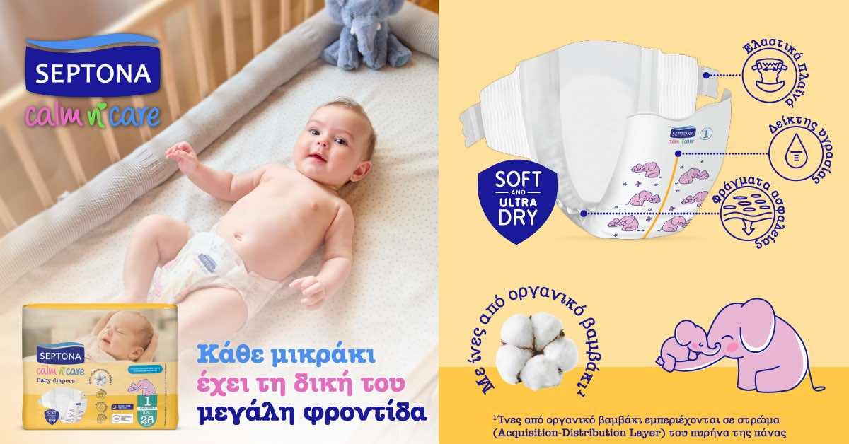 Ανακαλύψτε περισσότερα για τη νέα σειρά βρεφικών πανών Calm n’ Care στο website της Septona, www.septona.gr.